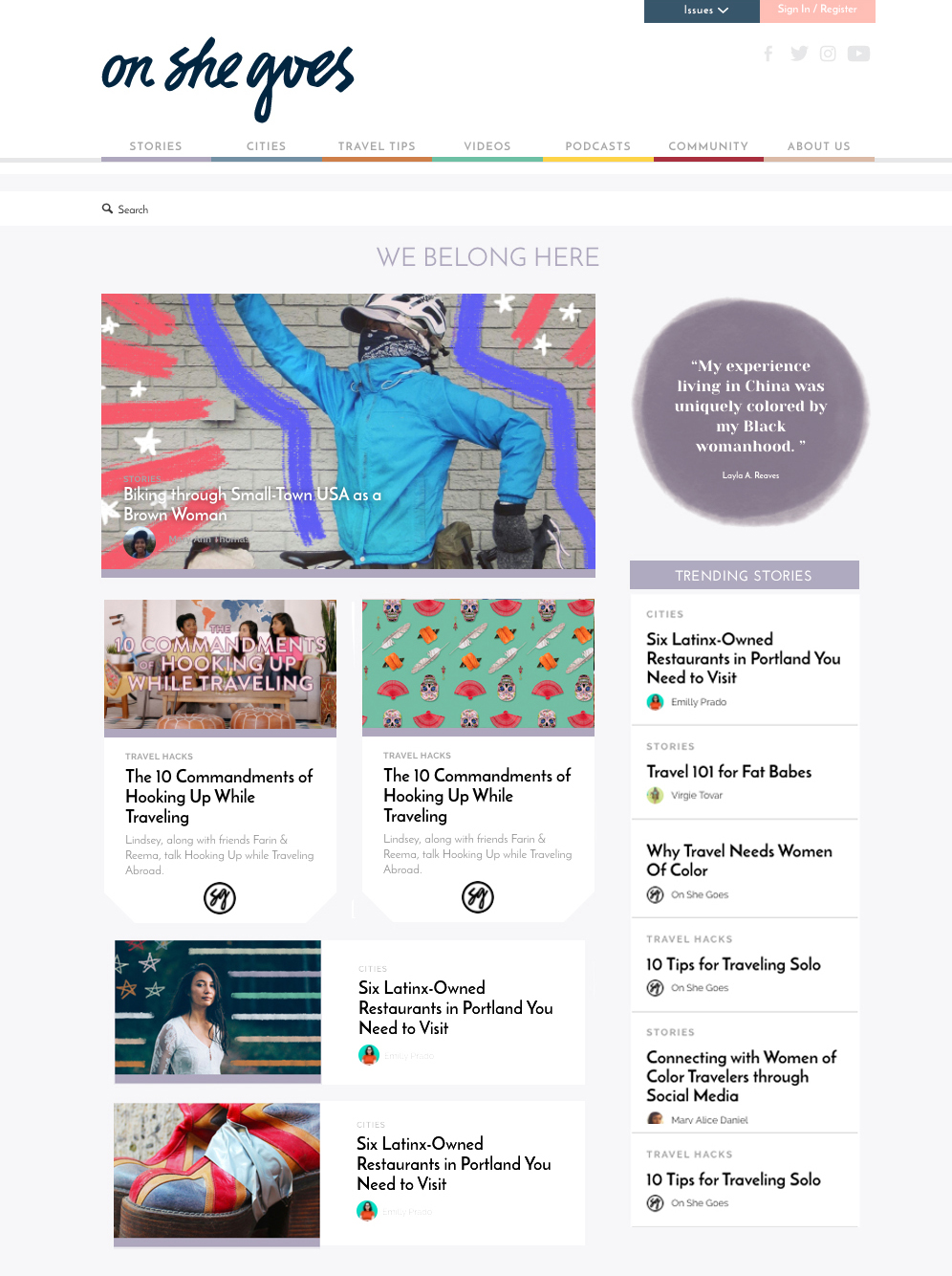 A badass group of WOC decided to create On She Goes, an online travel publication made by women of color for women of color. I was lucky enough to be in that group and lead the UX and design of the site.